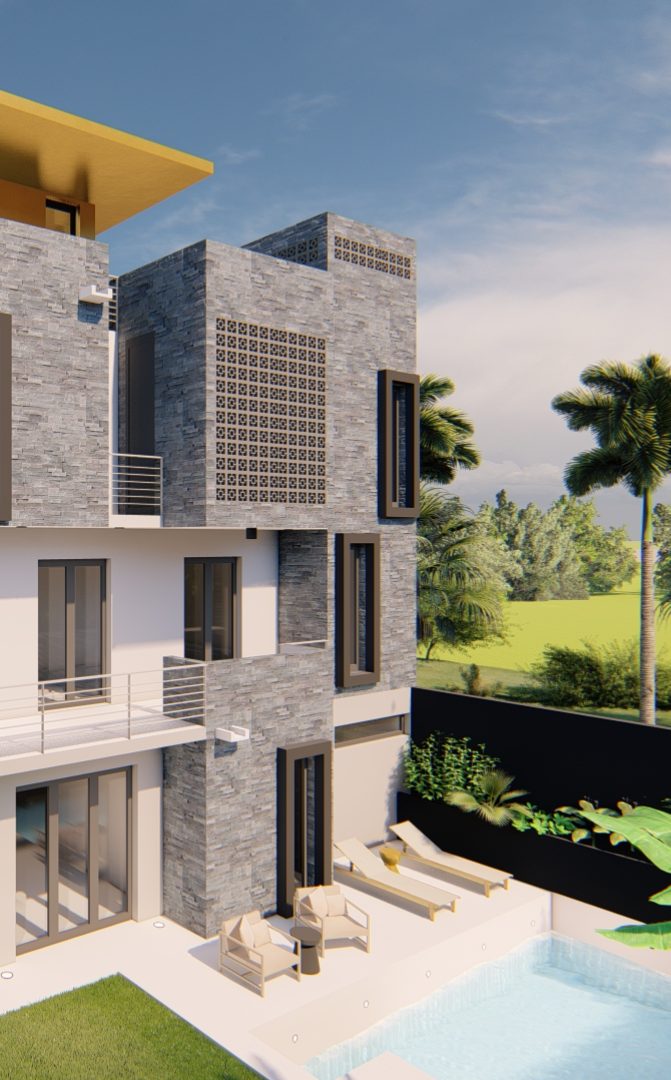 Immeuble à Bamako de 300m², donnant sur une piscine composé d’un appartement par niveaux. Des volumes soulignés par un parement en pierre gris invite à une relecture de l’architecture contemporaine malienne.